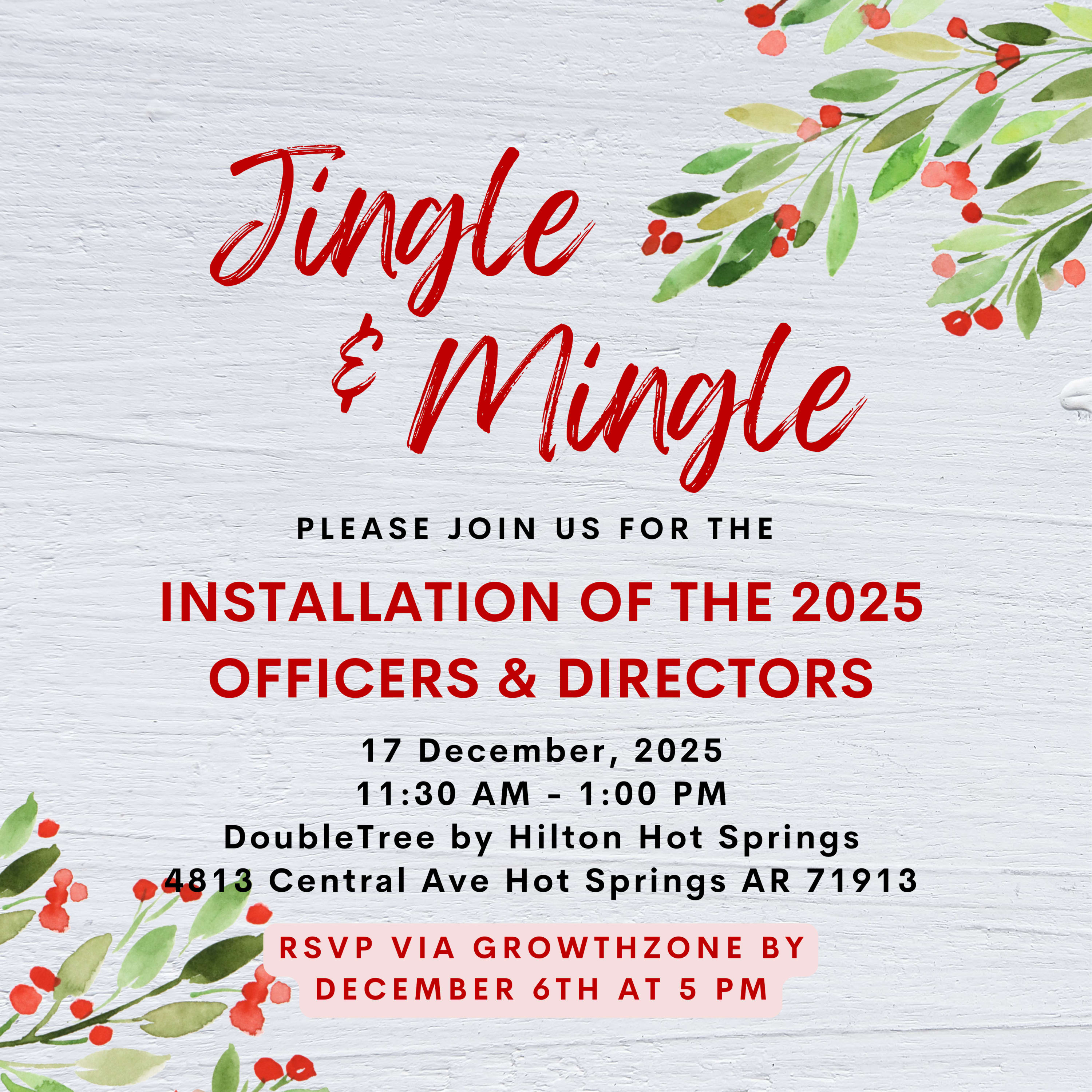 Celebrate the incoming leadership as we install our new 2025 Officers and Directors. This special event will take place on December 17th at the DoubleTree Hotel, located at 4813 Central Ave, Hot Springs, AR 71913. We will also vote on the updates to HSBOR's Bylaws and Policy and Procedures. Attendance is encouraged!